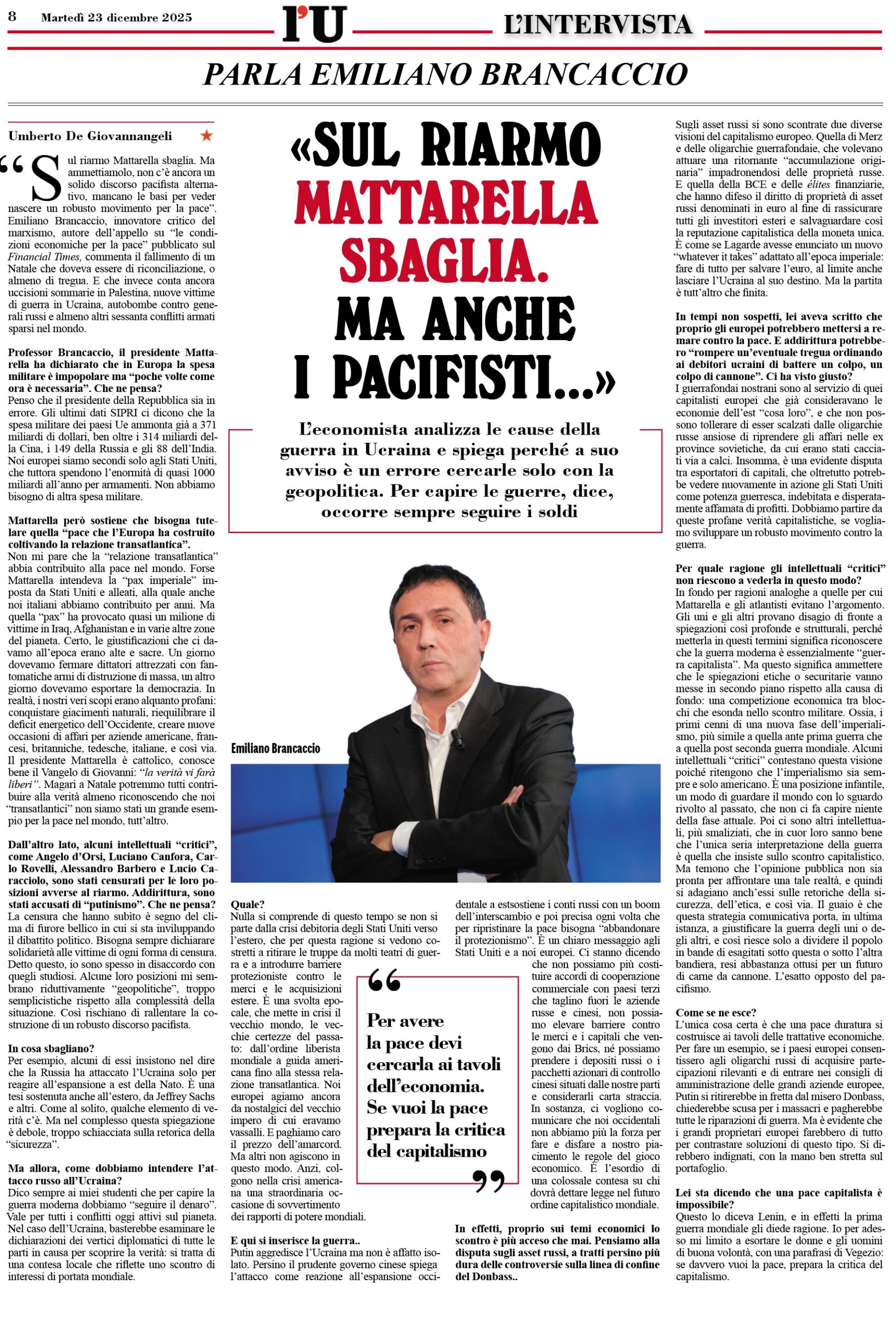 “Sul riarmo Mattarella sbaglia. Ma ammettiamolo, non c’è ancora un solido discorso pacifista alternativo, mancano le basi per veder nascere un robusto movimento per la pace”. Emiliano Brancaccio, innovatore critico del marxismo, autore dell’appello su “le condizioni economiche per la pace” pubblicato sul Financial Times, commenta il fallimento di un Natale che doveva essere di riconciliazione, o almeno di tregua. E che invece conta ancora uccisioni sommarie in Palestina, nuove vittime di guerra in Ucraina, autobombe contro generali russi e almeno altri sessanta conflitti armati sparsi nel mondo.